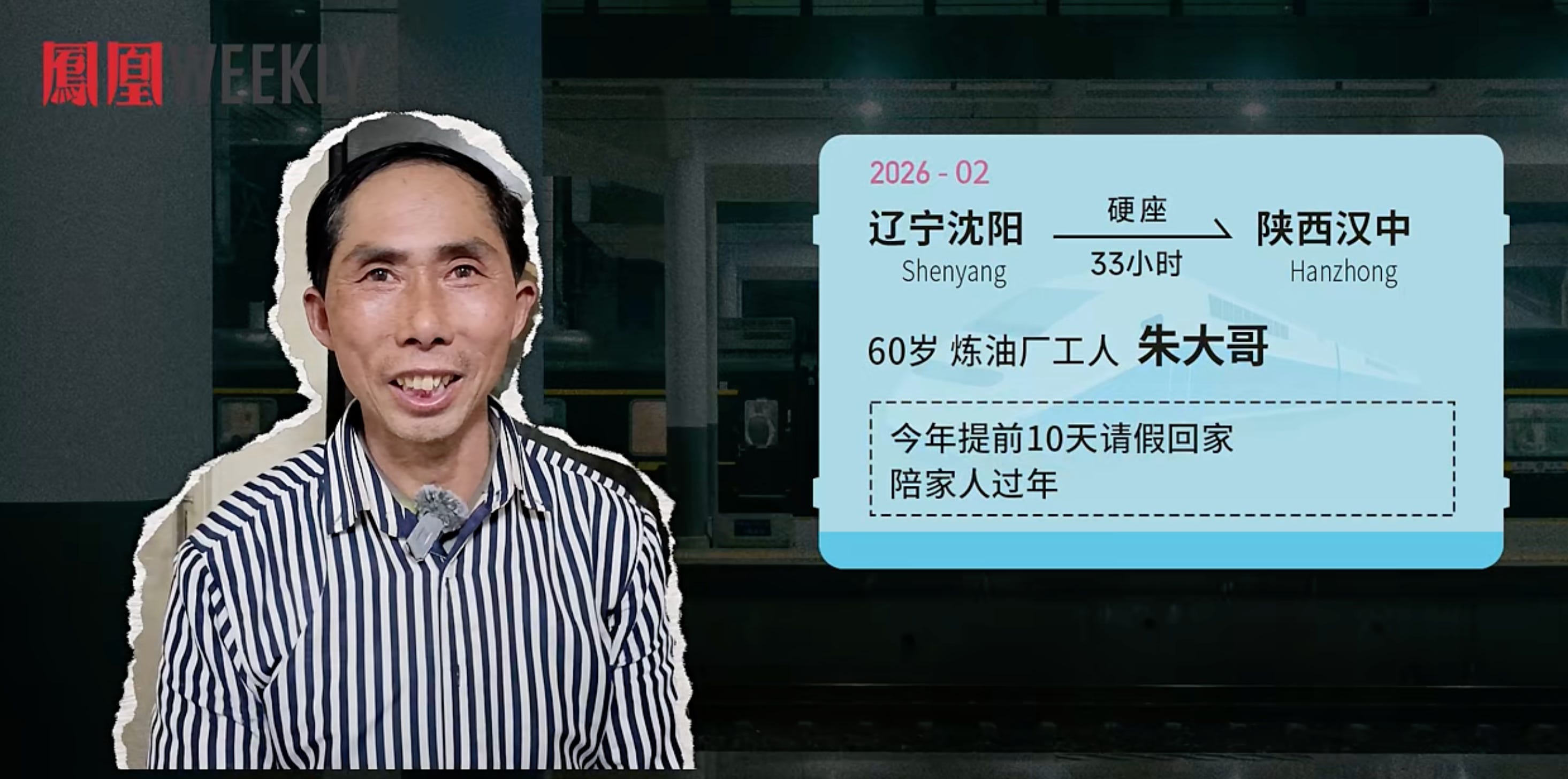 Shenyang, northeast China's Liaoning Province → Hanzhong, northwest China's Shaanxi Province (hard seat, 33 hours, nearly 2,000 km)