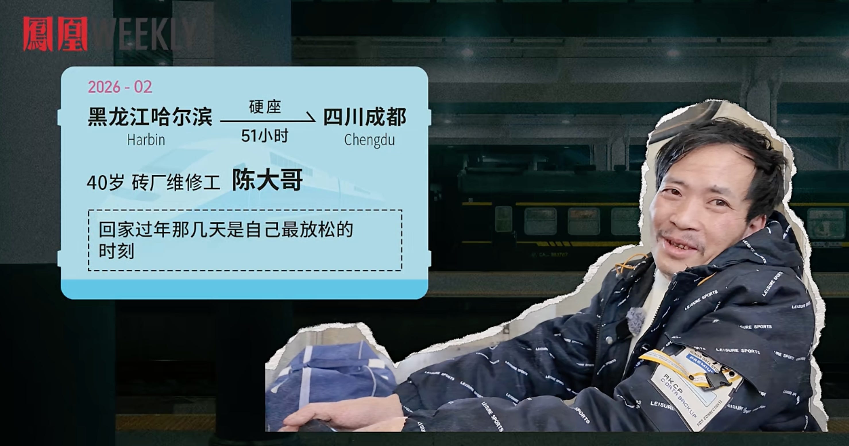 Harbin, northeast China's Heilongjiang Province → Chengdu, southwest China's Sichuan Province (hard seat, 51 hours, nearly 3,000 km)