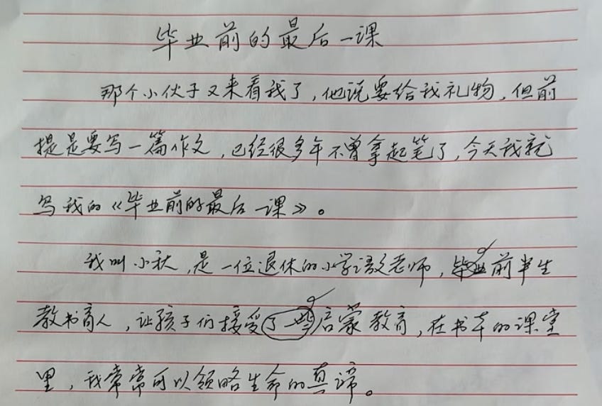 A vlogger who goes by "I am Si Yang" (我是四羊) posted a video inviting Ms. Zhang to take on a college entrance exam essay challenge. She drew the prompt titled "The Last Lesson Before Graduation", and wrote about her life after three decades in the classroom: how she took on debt to devote herself to rescuing stray animals.