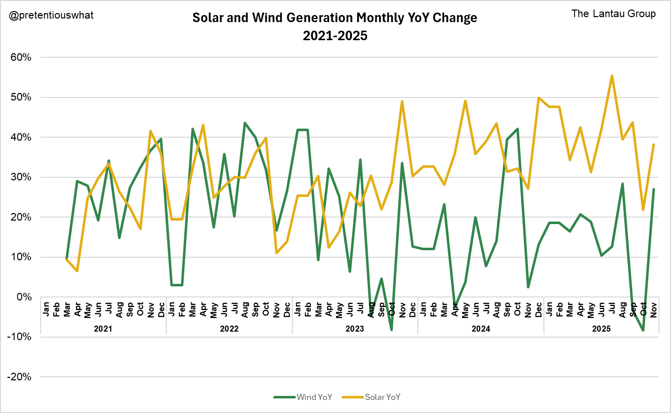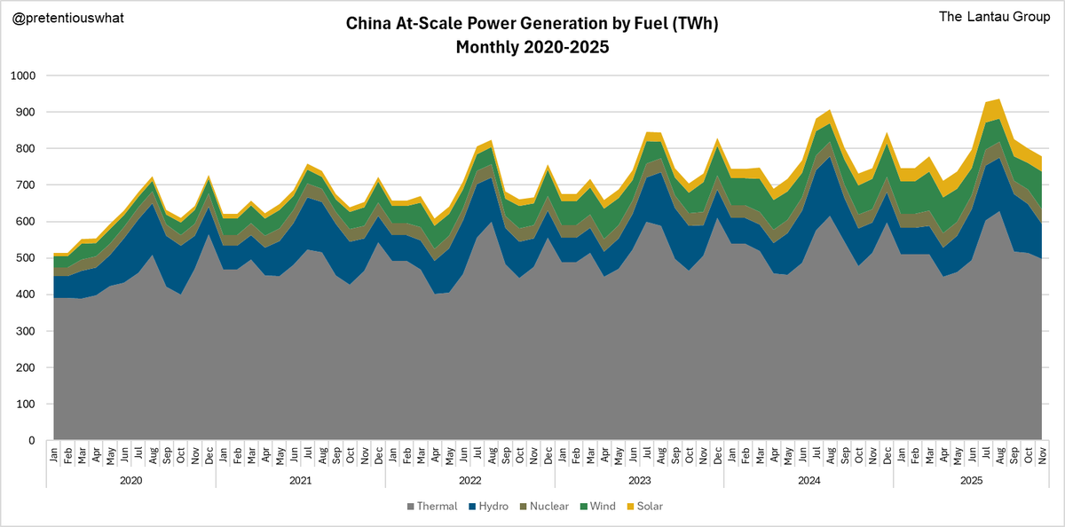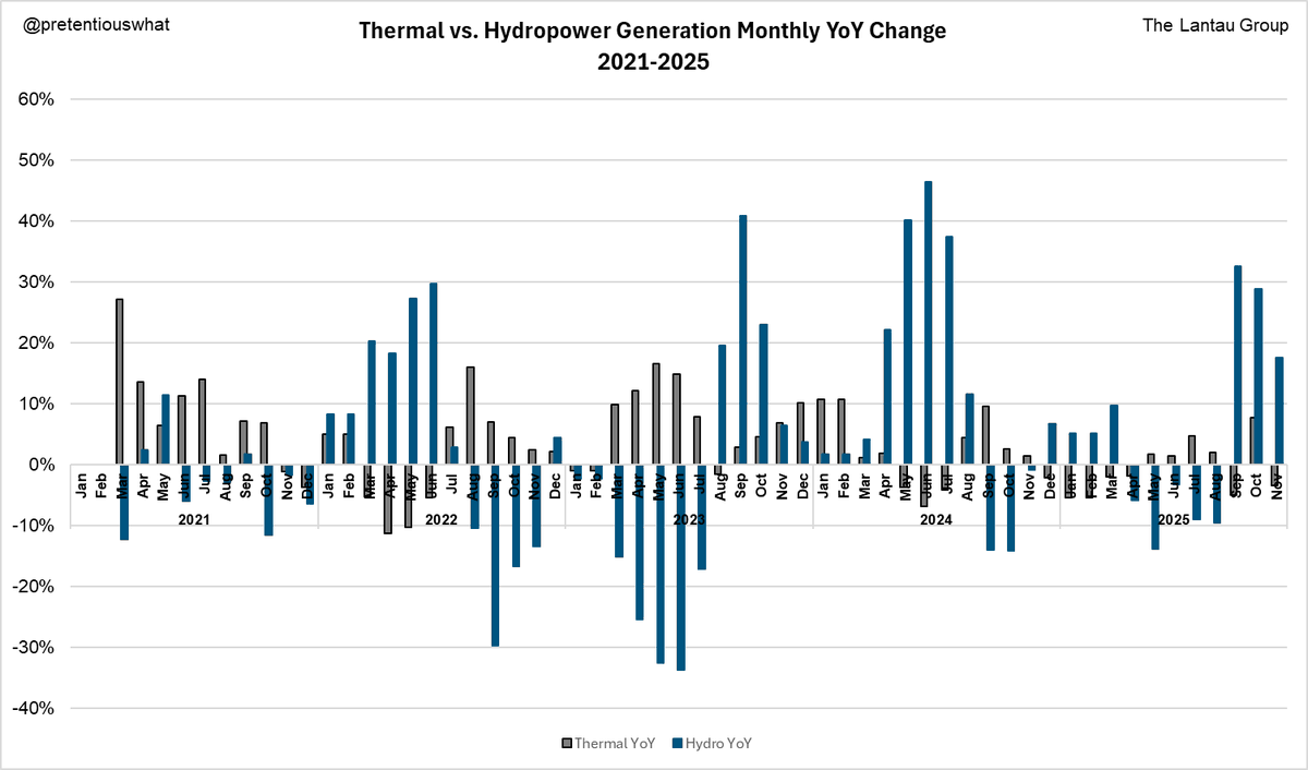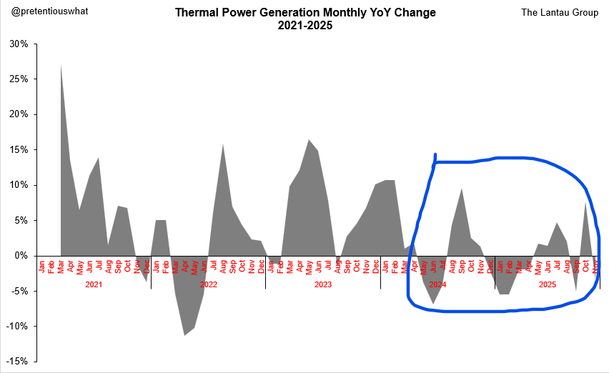 That's why recent NBS data show 2025 YTD (i.e., Jan-Nov) at-scale thermal generation is DOWN 0.7%, even though total at-scale power generation is up 2.4%.