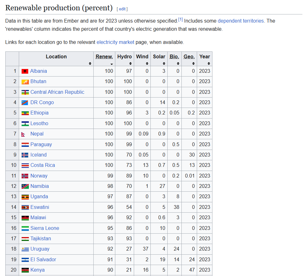 This is immediately obvious when we look at the list of countries that lead the world in % of power from renewable energy today - see any superpowers in there? It's lovely to be blessed with abundant hydropower or geothermal resources, but that hardly drives global change.
