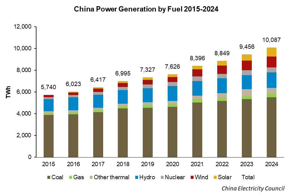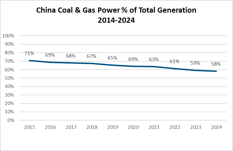 In the 2024 annual statistic yearbook published by China Electricity Council (CEC), coal comprised 54.8% of generation at the end of 2024, with gas-fired power adding another 2.6%. These numbers have been falling steadily for a decade and will fall again this year.