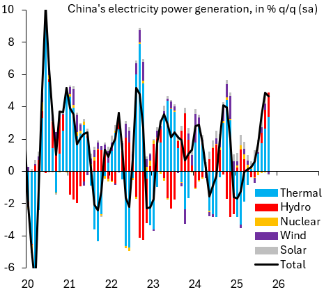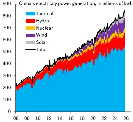 It's true that solar and wind are growing in importance, but let's keep things in perspective. Their shares in total electricity generation were five and nine percent, respectively, in October 2025 versus 67 percent from thermal power. Maybe China is electrifying, but what matters is where this power comes from and that's still overwhelmingly from fossil fuels.
